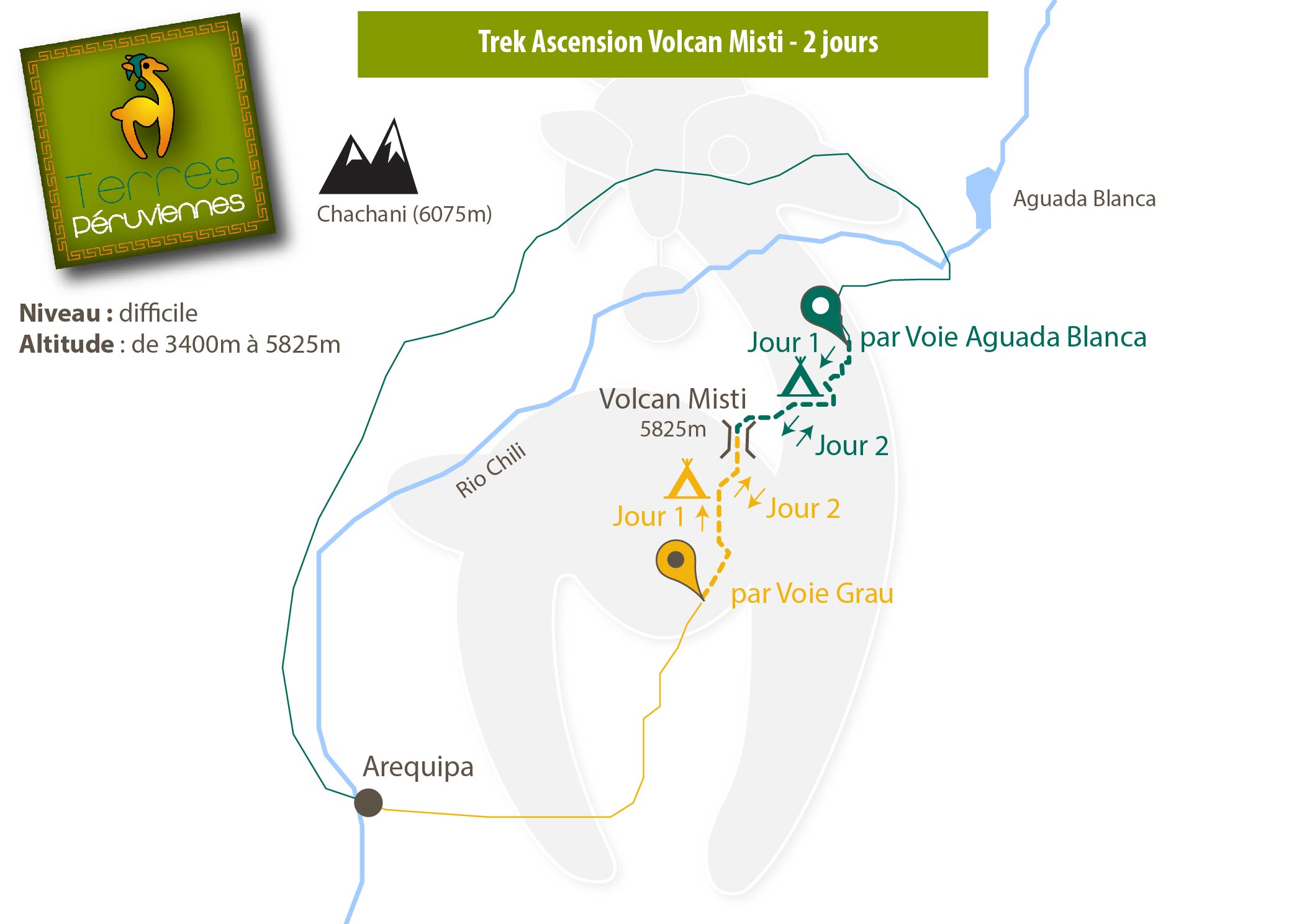 Situé dans la “Réserve Nationale de Salinas y Aguada Blanca”, entre les volcans Chachani (6075m) et Pichu Picchu (5500m), le Misti (5825m) est le gardien d’Arequipa (2360m). Se déroulant sur 2 jours, son ascension par la voie Grau ou Aguada Blanca et par une géologie lunaire ce trek constitue un défi pour les montagnards pour son terrain abrupte, son sol sablonneux (cendre volcanique), et son altitude élevée : 5825m, il est donc essentiel de disposer d’une bonne acclimatation et condition physique.
