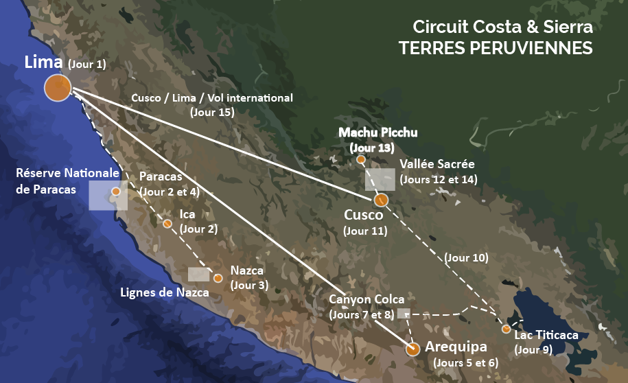 Ce circuit rassemble les composantes du voyage réussi: acclimatation, autonomie, culture, découverte, plein air, contact des populations « intemporelles » chez qui vous séjournerez (Lac Titicaca) et la nature variée du Pérou: paysages et cordillères des Andes, milliers d’ha. de terrasses du Canyon de Colca (plus profond du monde), lac Titicaca, sites spectaculaires de la Vallée Sacrée, décor tropical d’Aguas Calientes… L’«extraordinaire» est au rendez-vous par la découverte de la fabuleuse civilisation Inca, Cuzco (plus jolie ville d’Amérique du sud), du sublime Machu Picchu, etc…