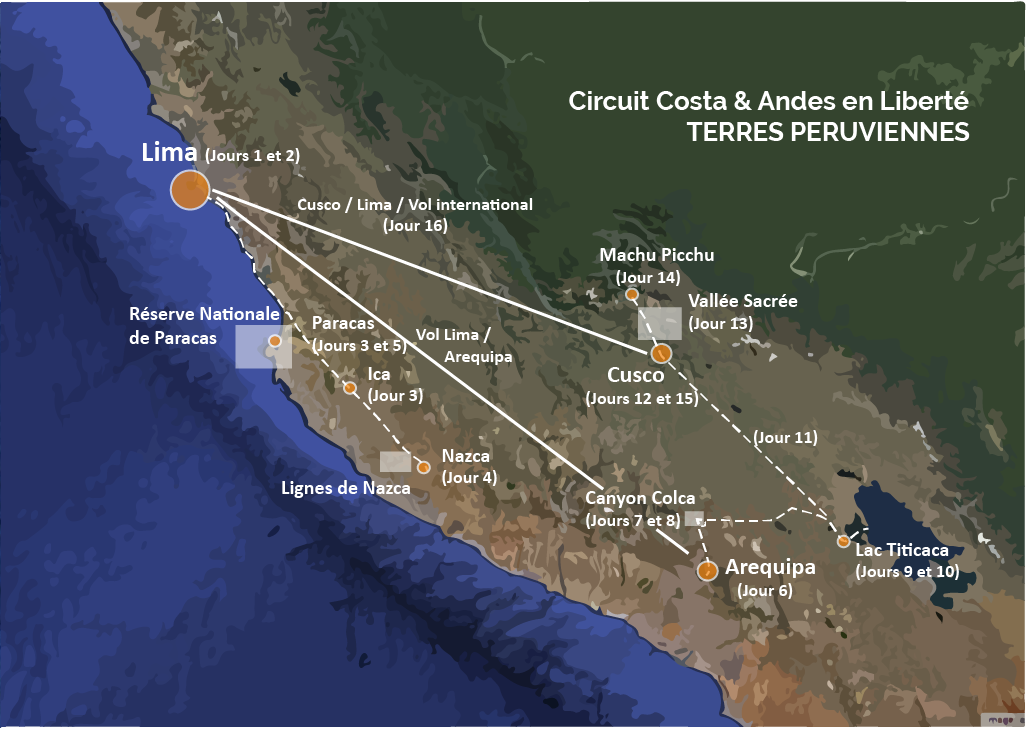 16 jours au Pérou parcourant la côte Pacifique et les Andes. Un circuit « Liberté » est destiné aux voyageurs désireux d’autonomie sur un séjour organisé, incluant les visites incontournables.