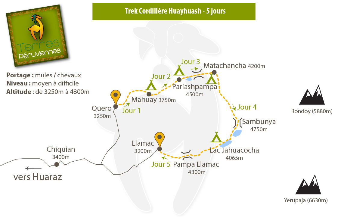 Ascension du col Sambunya (4 750 m). Descente vers le lac Solterococha (4 120 m) jusqu’au lac Jahuacocha. Bivouac. Déjeuner et dîner. Nuit sous tente.Jour 6 : Lac Jahuacocha (4 065 m) / Col Pampa Llamac (4 300 m) / Llamac (3 200 m) : fin du trek / Huaraz / Lima – 5/6h de marche
