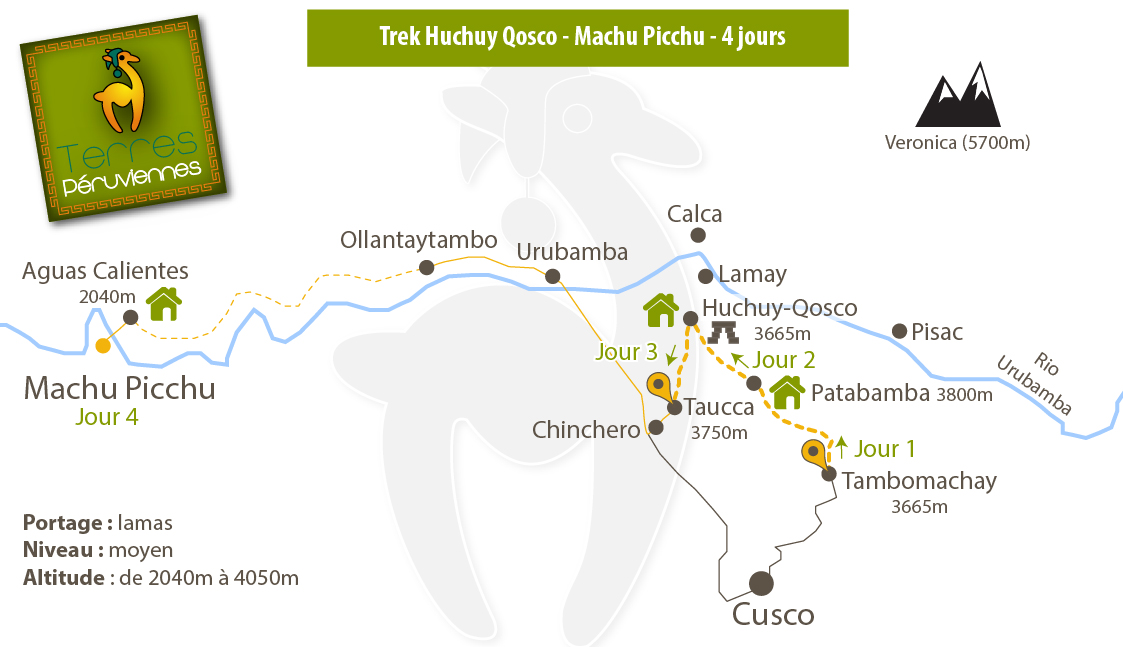 3h d’ascension progressive jusqu’au col de Pukamarca (4000m) par le sentier « balcon de la vallée Sacrée » avec magnifique panorama. Pique-nique. Descente jusqu’au site archéologique d’Huchuy Qosco (3700m) par un authentique sentier inca et par un ravissant petit canyon. Visite du site. Dîner et nuit dans une auberge chez l’habitant.Jour 3 : Huchuyqosco / Col Huallata / Taucca – 4h30 de marche – Ollantaytambo / Aguas Calientes (Machu Picchu)