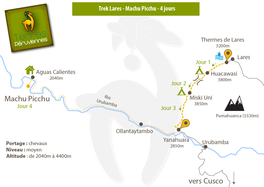 Ce trek qui débute aux eaux thermales naturelles de Lares, offre un authentique contact avec la vie andine par les localités traversées. Ces populations portent le poncho traditionnel, elles ont conservé des traditions textiles et agricoles, un contact avec la nature et un mode de vie ancestral. Elles font de ce trek une expérience intemporelle au cœur de paysages spectaculaires jusqu’au mythique Machu Picchu : la « cité perdue » des incas découverte en 1911 sous la végétation par Hiram Bingham.